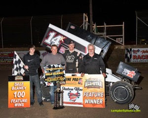 Dale Blaney’s storied career got a little sweeter Saturday night when he captured his 100th career All Star win at Attica Raceway Park worth $10,000 to become the all-time wins leader with the series. The victory was Blaney’s 1st on the young season and his 18th win ever at the western Ohio speedway. Dale kicked off the night by timing in 4th among the 36 car field. He then finished 5th in his heat which placed him into the “Pick Six” dash. Blaney shot from his starting spot outside of row one to win the dash and earn the pole of the 40 lap feature. Though he led every lap of the main event, it did not come easy as he had to fight off 5th place starter Craig Mintz who had pulled alongside of Blaney with less than 10 laps remaining.