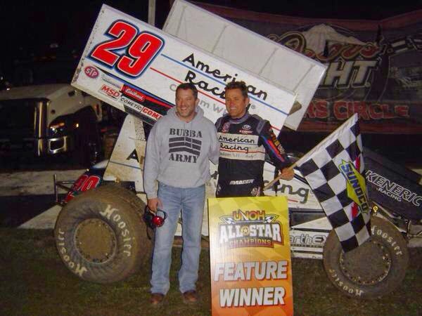 The Tony Stewart era of the All Star Sprints debuted tonight in Ocala. Steve Buckwalter Jr surprised the crowd by setting quick time among the surprisingly low car count of 22 sprints in attendance. Winter Heat at Cocopah standout Aaron Reutzel started on the pole in this one, flanked by Caleb Armstrong. And after 30 laps, WoO star and Australian Kerry Madsen found himself in victory lane by virtue of a last lap pass of Reutzel after having survived a strong challenge from Danny Smith.