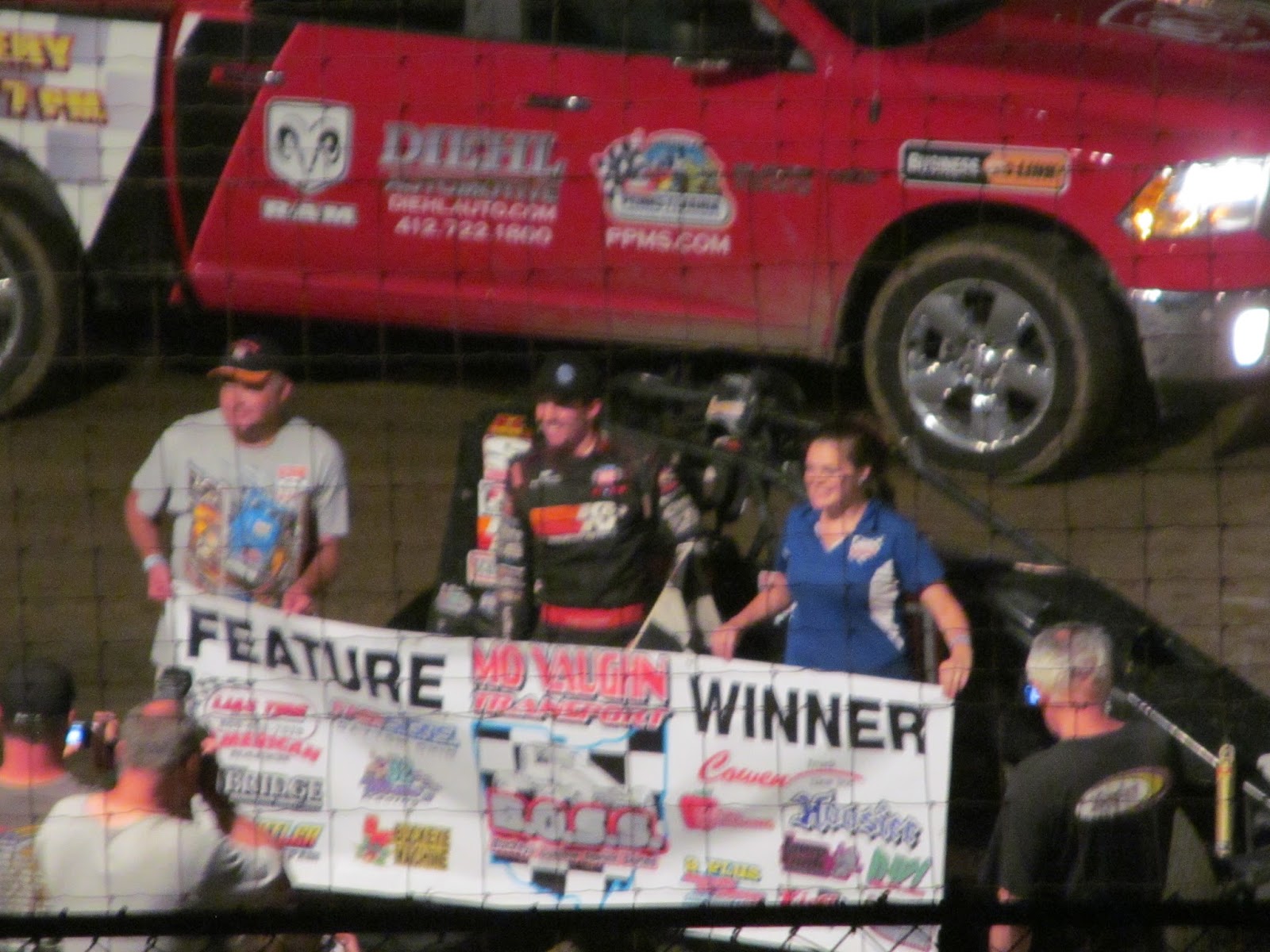 Finally the sun broke through! The big yellow ball in the sky was on display at Pittsburgh Pennsylvania’s Motor Speedway Saturday night. The action the track was highlighted by an appearance from the B.O.S.S. (Buckeye Outlaw Sprint Series) wingless sprints.  26 cars took to the clay for the chance to take home the winner’s share of the purse ($1500), and the battle for the win between Kody Swanson and Shawn Westerfield was a sight to behold!  In fact, we’re pretty sure that it would have made former Major League All Star Mo Vaughn (Owner of the title sponsor’s company Mo Vaughn Trucking) proud.