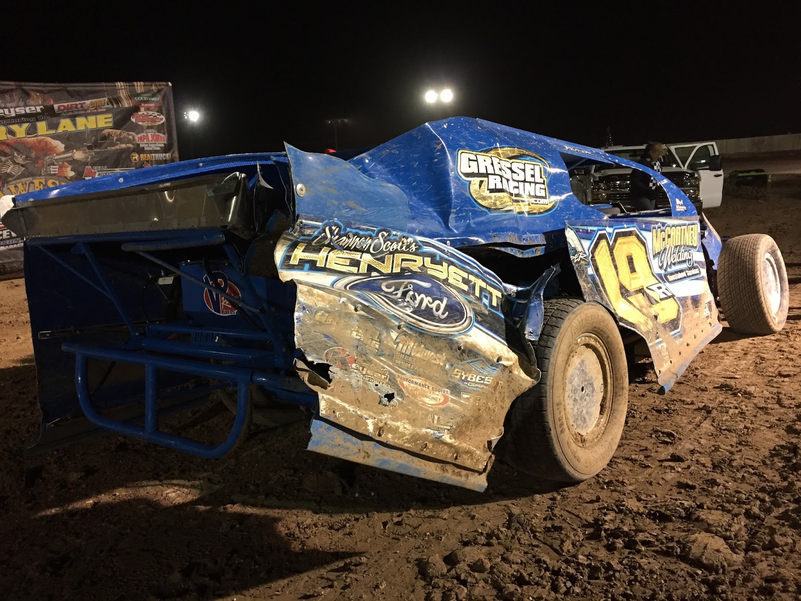 Friday night’s Modified feature was very similar to Wednesday’s feature. There were a couple of early cautions, slowing the pace and not allowing for drivers to get “in a groove”, but once they got rolling, they put on another great show! Much like the previous 3 nights of racing, the track was mostly dry on the bottom, with a little moisture up-high. There were only a few brave (crazy) souls who dared to run the top, which included 4th place starter, “The Reaper” Ryan Gustin! Cade Dillard also dared to run the top side, but confirmed the risks, when he clipped wall on exit of turn 4, shooting him nearly head-first into the front straightaway wall, ending his night and possibly his weekend. From what I saw, there was substantial damage to the rear end of the 97 Modified and his transporter left the pits at night’s end. After Dillard’s car was removed from the track on lap 12, the final 13 laps were run under green. After Dillard retired for the night, the only driver running the outside was Gustin and he was clearly the fastest car on track! However, it did come at a price, as “The Reaper” hopped the tiny cushion several times, slapping his right rear against the outside wall. That was not enough to slow Gustin down, however, as he went on to win his 2nd consecutive $1,000 payday, winning by nearly a full straightaway. Early race leader, Matt Leer and pole-sitter Brad Dierks, enjoyed solid runs, finishing 2nd and 3rd!