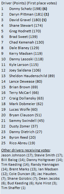 The two drivers who dropped out of the rankings from last week’s poll were California’s Tim Kaeding and Louisiana’s Jason Johnson.