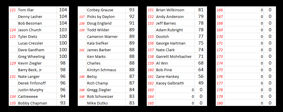 The 162 entries that filled the scoresheet this year blew away last year’s event high of 52. So first things first, thanks to everyone that participated. I hope this fantasy contest made the event a little more fun and and that you’ll join us for more Pickems in the near future!