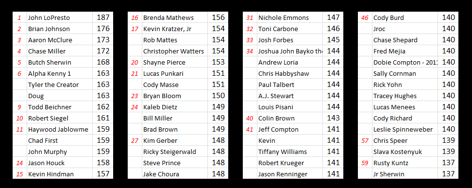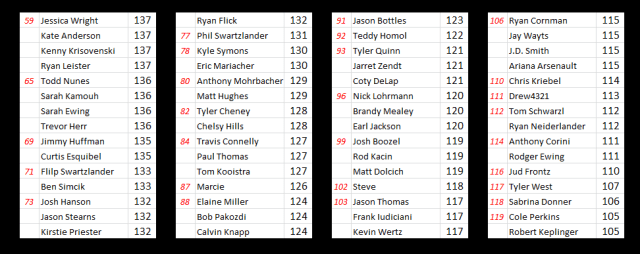 The 162 entries that filled the scoresheet this year blew away last year’s event high of 52. So first things first, thanks to everyone that participated. I hope this fantasy contest made the event a little more fun and and that you’ll join us for more Pickems in the near future!