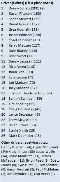 Also moving into the poll for the first time in over a month is the up-and-coming NASCAR star Kyle Larson. The California native raced he was out of the B-Main on Saturday to earn the 21st starting spot in the Feature. He was not done yet, as he raced up 16 positions to finish fifth and grab the hard charger award. Larson, who was unranked, now occupies the 14th spot in the Top 25 rankings.