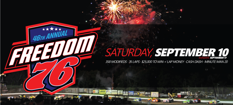 What: 46th Freedom 76er; 76 lap- $25,000 to win 358 Modified Championship