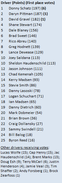 Three drivers split the 8 first-place votes this week, with Donny Schatz claiming six while Daryn Pittman and David Gravel hold one apiece to their names.