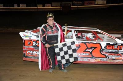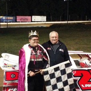 With 12 laps down, the caution flag waved again for a spin in turn two, and gave Barbara another opportunity to take the lead away from Lake. But the 15 year old pilot was able to hug the bottom of the surface and gave little for Barbara to look at as Miller moved underneath Dalton to take the third spot away. The green flag would stay out the rest of the way as Lake and Barbara made it a two car fight to the finish during the extended run as they separated from Miller. Barbara, who was within a half second of Lake would make one last gasp effort to take the win from Lake when he went in on the top side of the surface with momentum but was unable to pull even or pass for the win coming to the stripe, and at the end of 30 laps, Lake held on to take the win by .434 seconds.