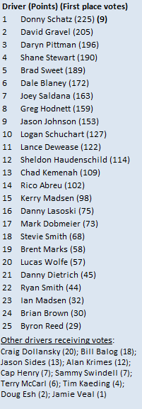 In order for them to move up, three drivers had to drop out of the rankings to make room for the PA Posse. Craig Dollansky, Sammy Swindell, and Bill Balog are the drivers that fell out of the Top 25.