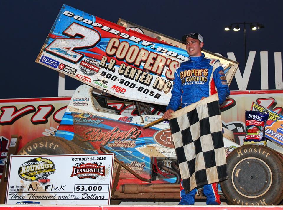 AJ Flick had achieved much in his sprint car years at Lernerville. Flick had seen his fair share of feature wins and track championships, and also provided some edge of your seat action to the delight of the fans over the years. However one thing he hadn’t done until now, was to stand in victory lane at the final event of the season, until Saturday night. Flick stayed patient in the early going as he watched George Hobaugh Jr take the early lead, then seized an opportunity and never looked back en route to the win.