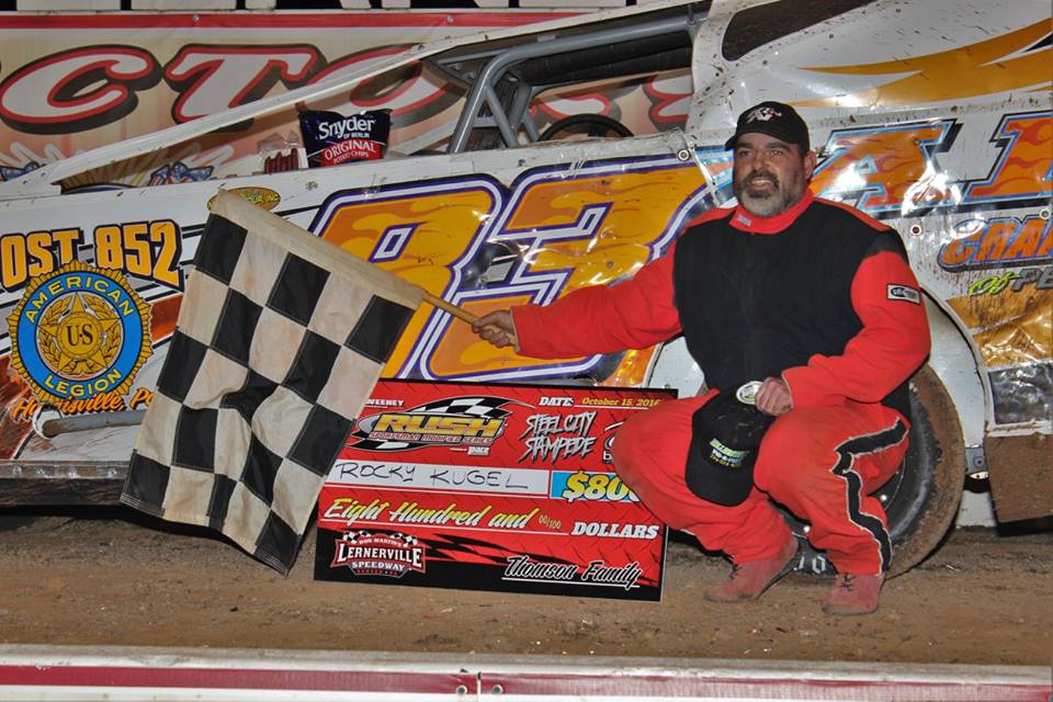Rocky Kugel almost didn’t make the second half of the 2016 campaign, but during his second half of the season run with a new carr and victory on Saturday night at Lernerville, Kugel has to be one happy camper. The RUSH Sportsman Modified standout held off stiff challenges from Jeff and Brian Schaffer en route to the win in the $800 to win, 20 lap feature even that brought an end to the season and saw Brian and promising young driver Chas Wolbert settle the touring season championship.