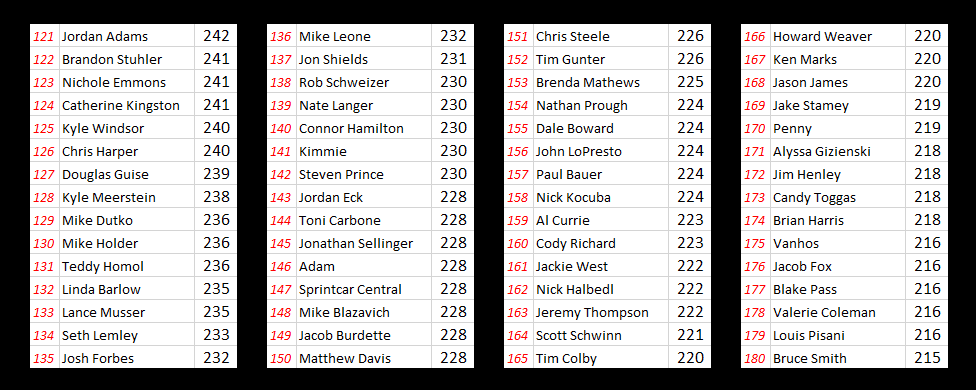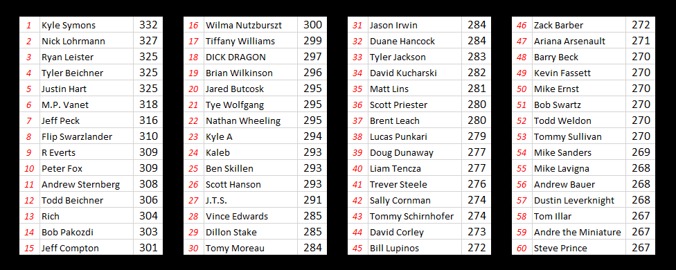 Kyle Symons (@livedirtupdates) started off strong. He leads after the first round of features by a slim margin over Nick Lohrmann (@NLohrmann25). We currently have a three-way tie to round out the podium between Ryan Leister, Tyler Beichner (@tyler_beichner), and Justin Hart (@Justinhart1h).