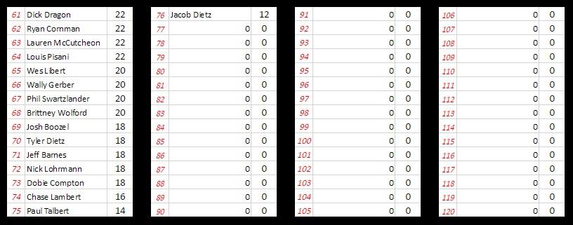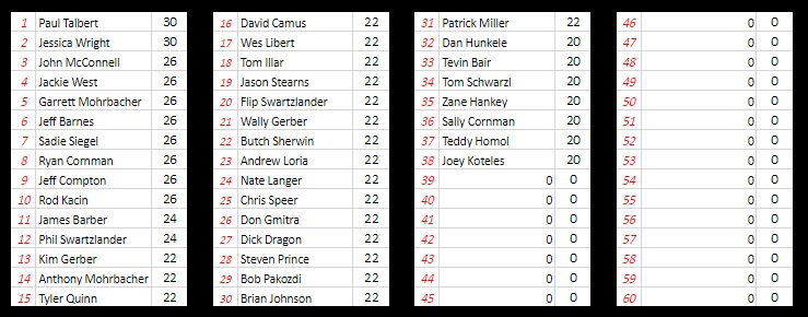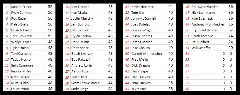 Week 15 Winner: Steve Prince, Ryan Cornman, Rod Kacin, Kaleb Dietz, and Brian Johnson all tie with 56 points each!