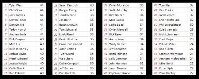 Week 6 Winner: Joey Koteles, Tyler West, Steven Prince, Andrew Loria, Don Gmitra, Teddy Homol, Christopher Speer all tied with 44 Points