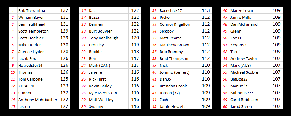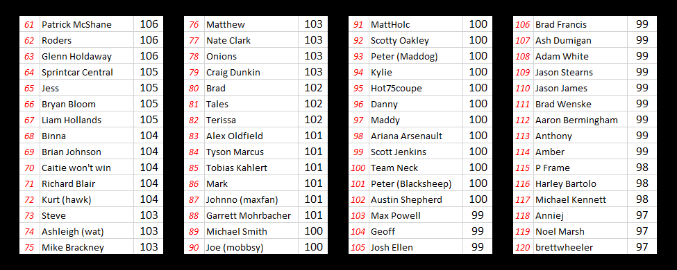 Here are your up-to-date Pick-Em standings heading into tonight’s finale at the Grand Annual Sprintcar Classic. In an extremely tight race at the top, you’ll find the Top 20 contestants within ten points of each other. Good luck tonight to everyone entered!