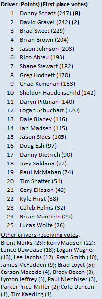 Once again, Donny Schatz hangs on to the top spot, however David Gravel claimed two first-place votes for the second week in a row. Brad Sweet, Brian Brown, and Jason Johnson round out the Top 5.