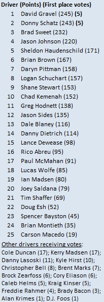 Donny Schatz relinquishes the top spot but only drops one spot to No. 2 on our list. The duo split the first-place votes with five apiece, but it was Gravel obtaining more total votes overall. Not far behind them are Brad Sweet and Jason Johnson, who are having fantastic season in their own rights and are just a few points away from moving further up the board.