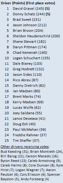 The drivers on the move this week were Brent Marks and Kerry Madsen, who moved up to Positions 17th & 18th, respectively. Neither driver was ranked in last week’s poll. Brent Marks drove home to Pennsylvania following the World of Outlaws’ rainout announcement. He then proceed to pick up the win at Port Royal Speedway. Madsen ran runner-up at Knoxville after nearly making a pass for the lead late in the race.
