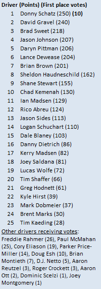 The three drivers moving up into our Top 25 Rankings this week are Kyle Hirst (22), Mark Dobmeier (23) and Tim Kaeding (25). Hirst returns to the poll for the first time since April 9th, meanwhile Dobmeier and Kaeding are each making their season debuts. Making room for that trio of drivers was Paul McMahan, Freddie Rahmer and Doug Esh who drop out of our Top 25.