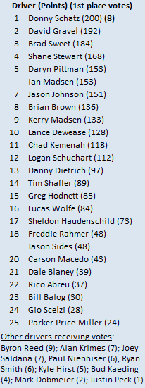 The aforementioned Balog makes his first appearance in our Top 25 rankings following multiple appearances in 2016, meanwhile a young driver from Fresno, Calif. is making his career debut in the poll. Giovanni Scelzi has shown much promise in his limited starts, and this past weekend he won the NARC show at Thunderbowl Speedway for his second consecutive series win.