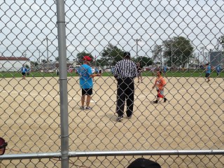 | Rico Abreu (orange) approaches home plate where Doug Clark serves as the game’s free-talking “referee” |