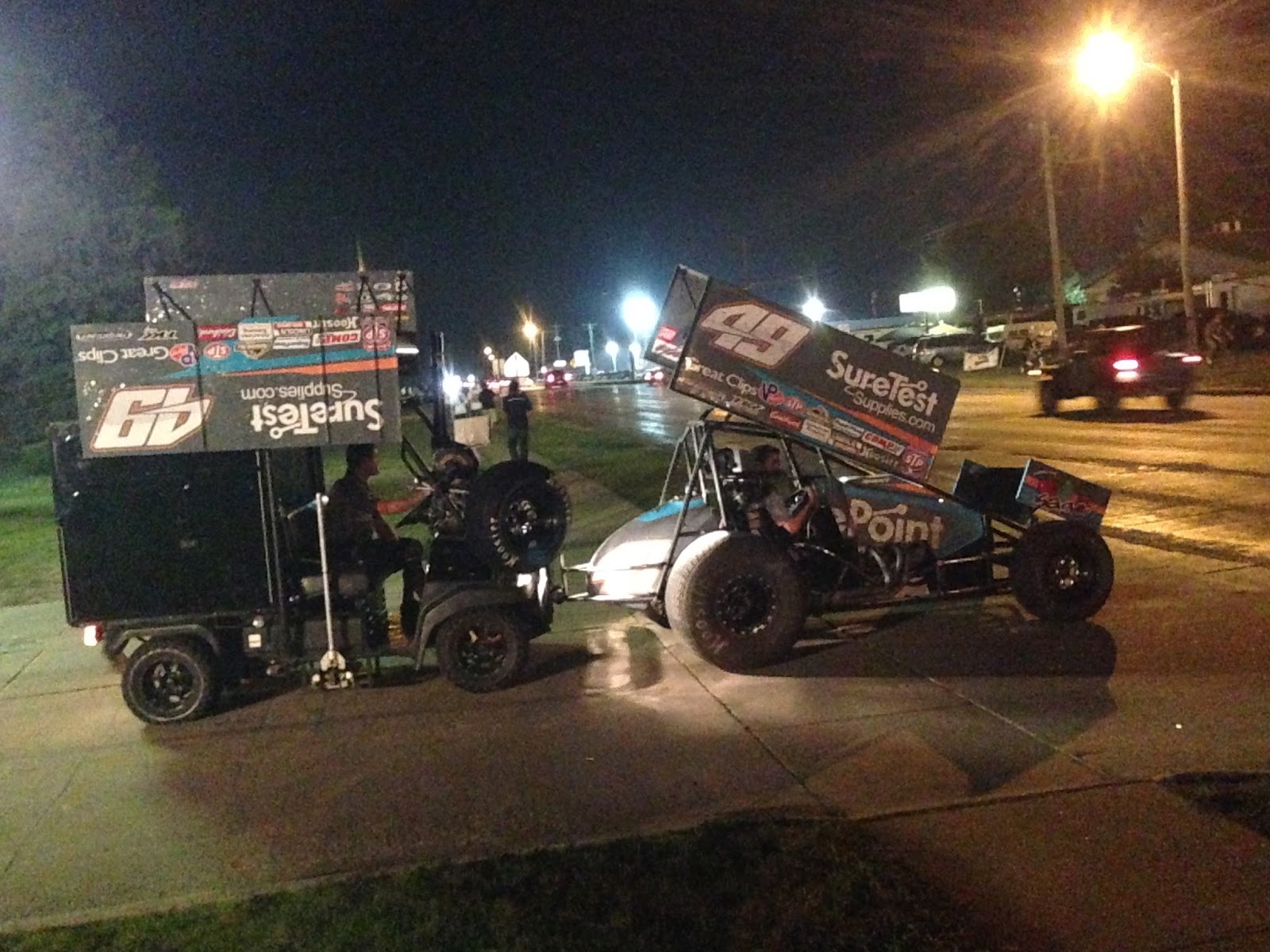 | Brad Sweet and his KKR Team wait for traffic to clear, so they can push his Sprint Car across the city street |