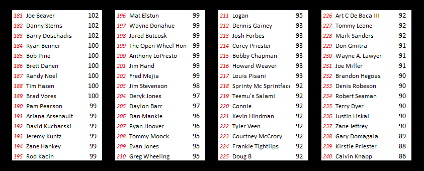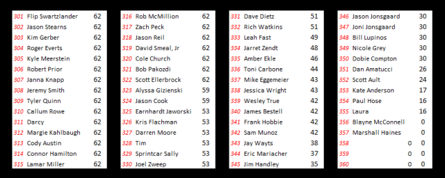 Nonetheless, Jary Thompson (@skullpuppy6) leads the way with 194 over Joe Hartsel and Jason Renninger (@jasonrennn).