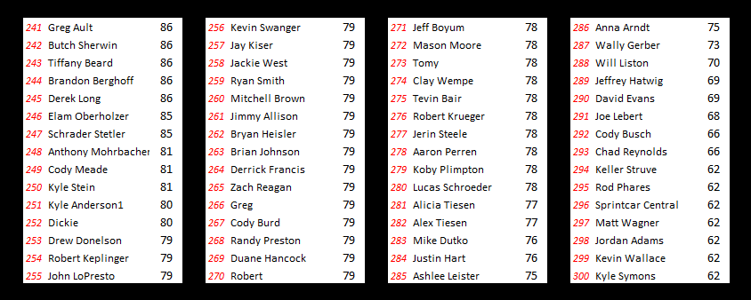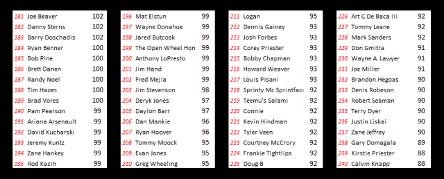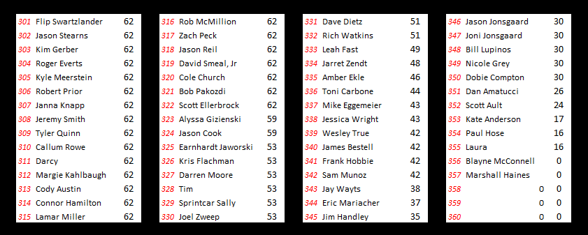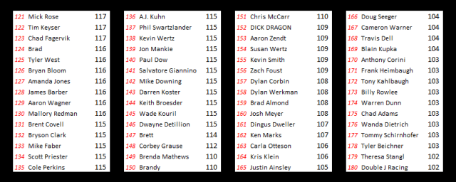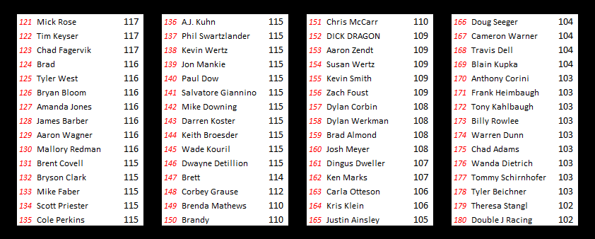 Your position in the standings are hard to analyze right now as only half of the field has ran their preliminary night. Some contestants may have had 1 or 2 drivers take to the track this evening, meanwhile someone else may have had all 6 of their drivers included on Preliminary Night #1.