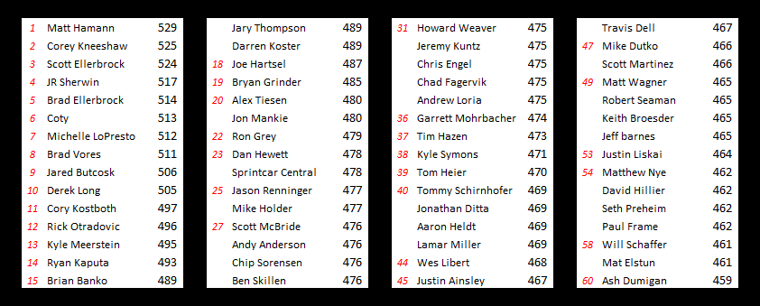 After lingering near the front all week, Corey Kneeshaw (@CoreyKneeshaw) finds himself finishing in the runner-up spot where he’ll receive a free tshirt from R&R Racewear for his efforts. Kneeshaw’s list of drivers included Donny Schatz, Kerry Madsen, Daryn Pittman, Terry McCarl, Greg Hodnett and Austin McCarl.