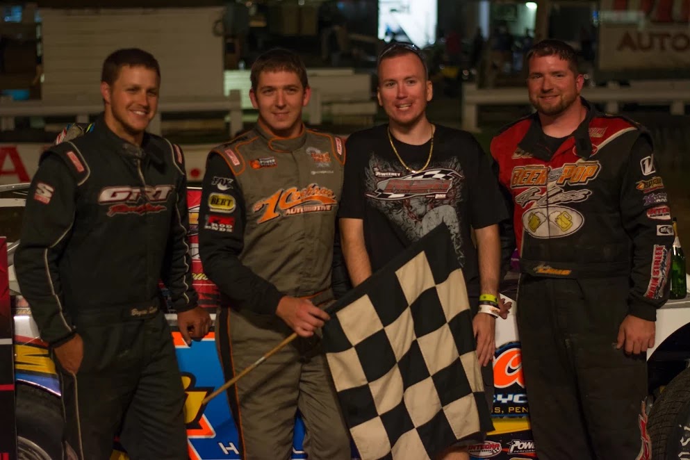 Imperial, PA (August 12, 2017) Sometimes you’ve got to be both lucky and good, and on Saturday night at Pittsburgh Pennsylvania’s Motor Speedway, Mike Pegher Jr. was very much both as he caught a break and made the most of it on his way to a $4010 payday in the annual Jook George Memorial. Pegher was able to miraculously avoid a spinning Jamie Wrightsman on lap 17, a spin that collected leader Jacob Hawkins and caused damage to third running Russ King, and then kept the field behind him the rest of the way.