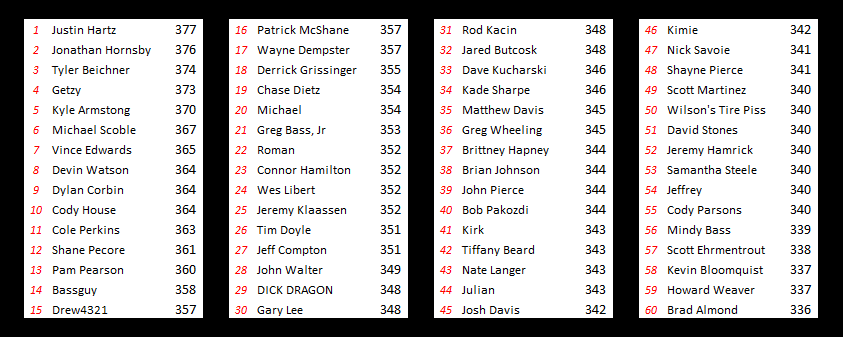 Coming home in fourth place and receiving the third place prize is Getzy (@tgetzt). He charged forward from his fifteenth place following night one to land firmly in the top five. His drivers were Brian Brown, Schatz, Schuchart, Brandon Sheppard, Madden, Clanton, Matt Sheppard and Britten. Getzy will be the lucky recipient of a $15 Subway gift card.