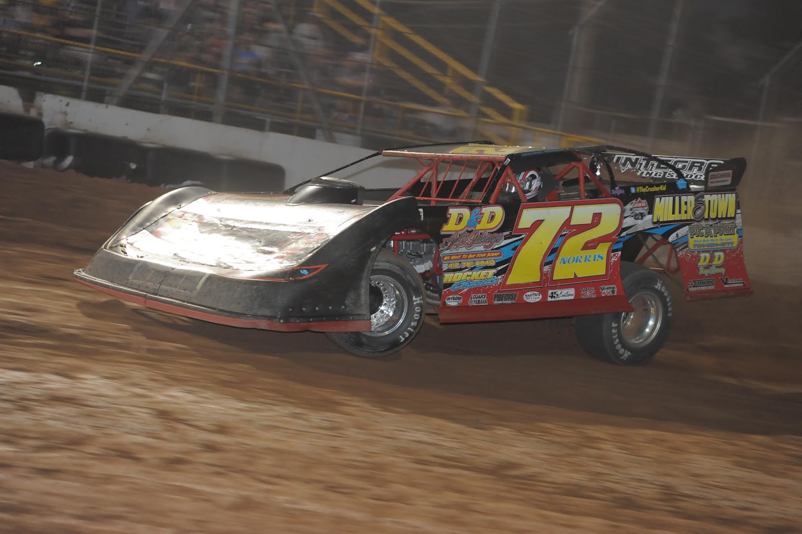 Norris split the lapped cars of Collin Burke and Bob Moore in turns three and four while Pegher slowed on the backstretch. McClellan and Angellichio kept battling door to door past the halfway point, trading the second position several times when the action came to a halt for a slowing John Flinner with 15 laps down. When action resumed, Norris bolted out to a half straightaway lead that looked completely unbeatable until Gary Lyle brought out the caution with 24 laps down, setting up a green, white, checkered finish. On the restart, Norris quickly but all hopes from his competitiors away, leaving them to a four car battle for the second position which Angellichio won while Norris cruised to yet another victory.