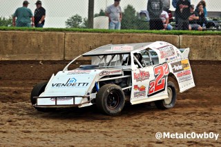 The field restarted single file with Junghans in the lead followed by Sheppard, Madden, Briggs, and 12th starting Mike Marlar. Junghans was able to quickly jump out to a 4 car-length lead on the field, however Sheppard again attempted to track him down. Sheppard In the low line was able to draw as close to the lead as Junghans rear quarter panel in the corners, however Junghans on the top line would not be denied the win.