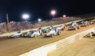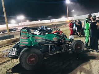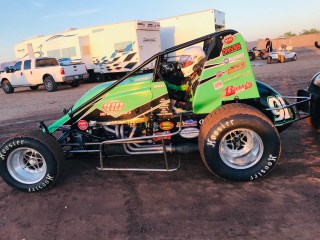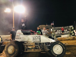 The Arizona Speedway Track Crew decided to do work on the surface, just as the feature was rolling onto the track. All cars and teams were asked to sit in the infield for approximately 20 minutes while Jonah watered the outside of the track and tilled the bottom of the surface, in both corners. After what seemed like an eternity, they were ordered to the track and given several hot pace laps to work the surface in. As is customary at every USAC event, the field a 4-wide salute to the fans!