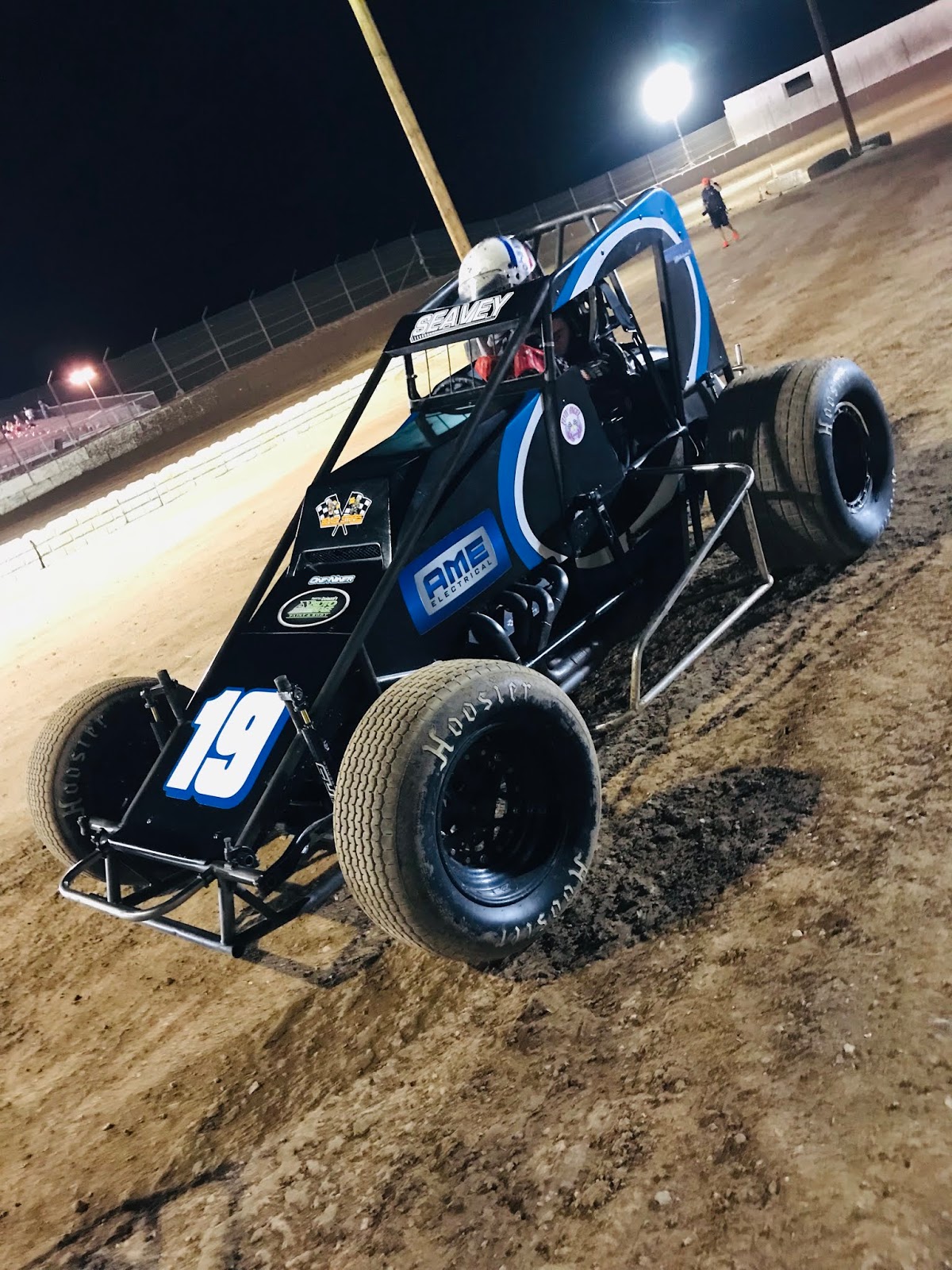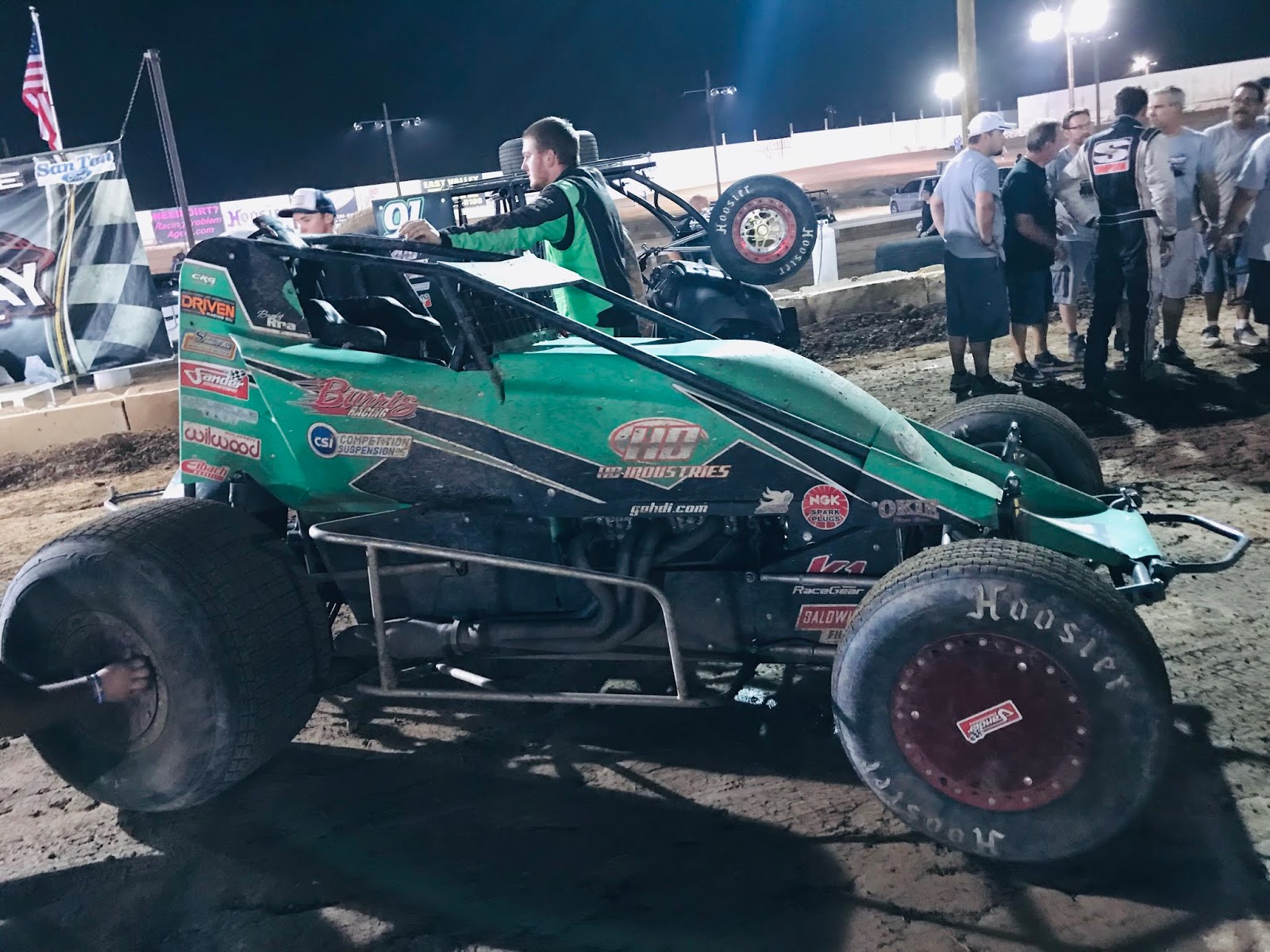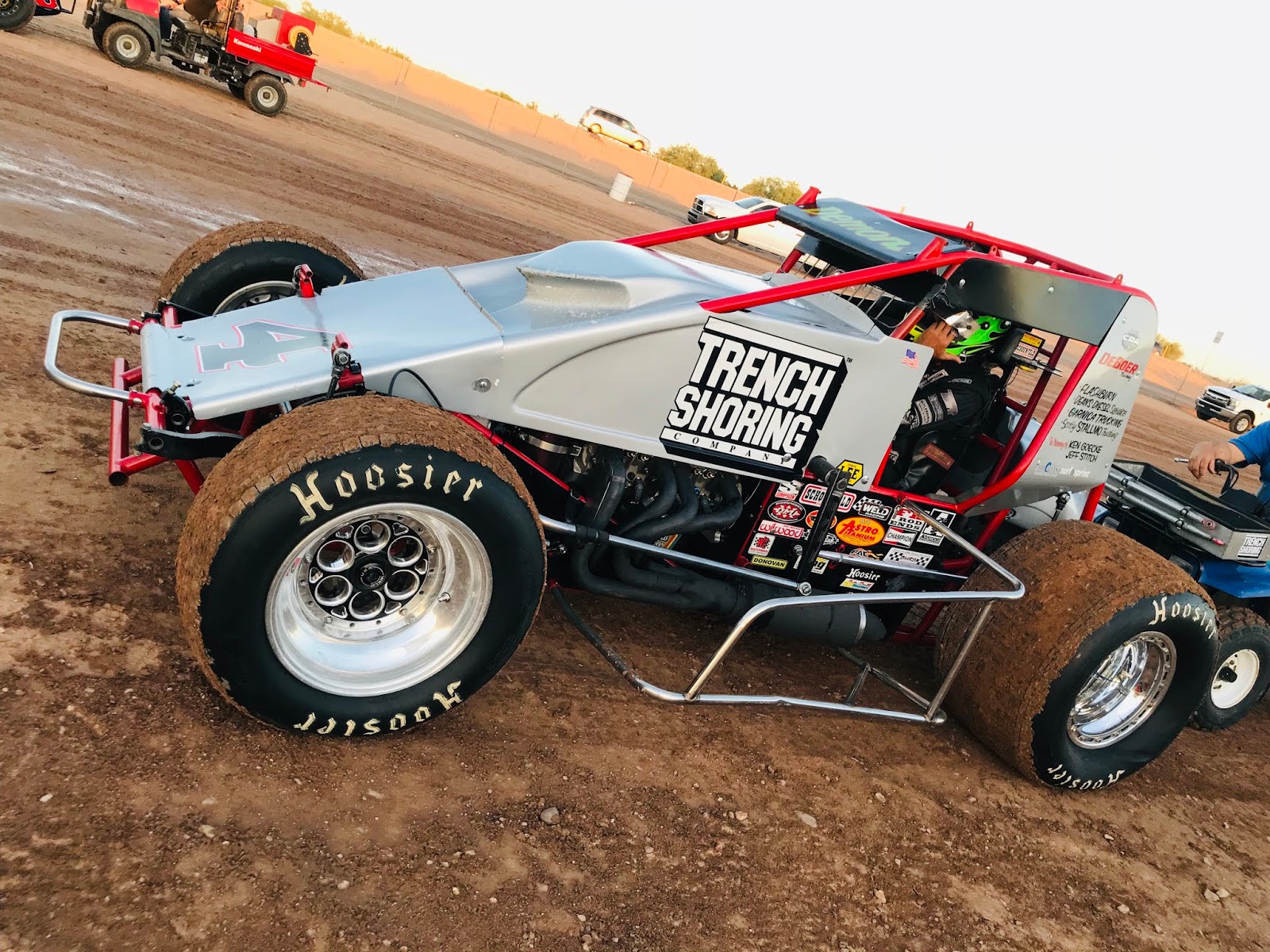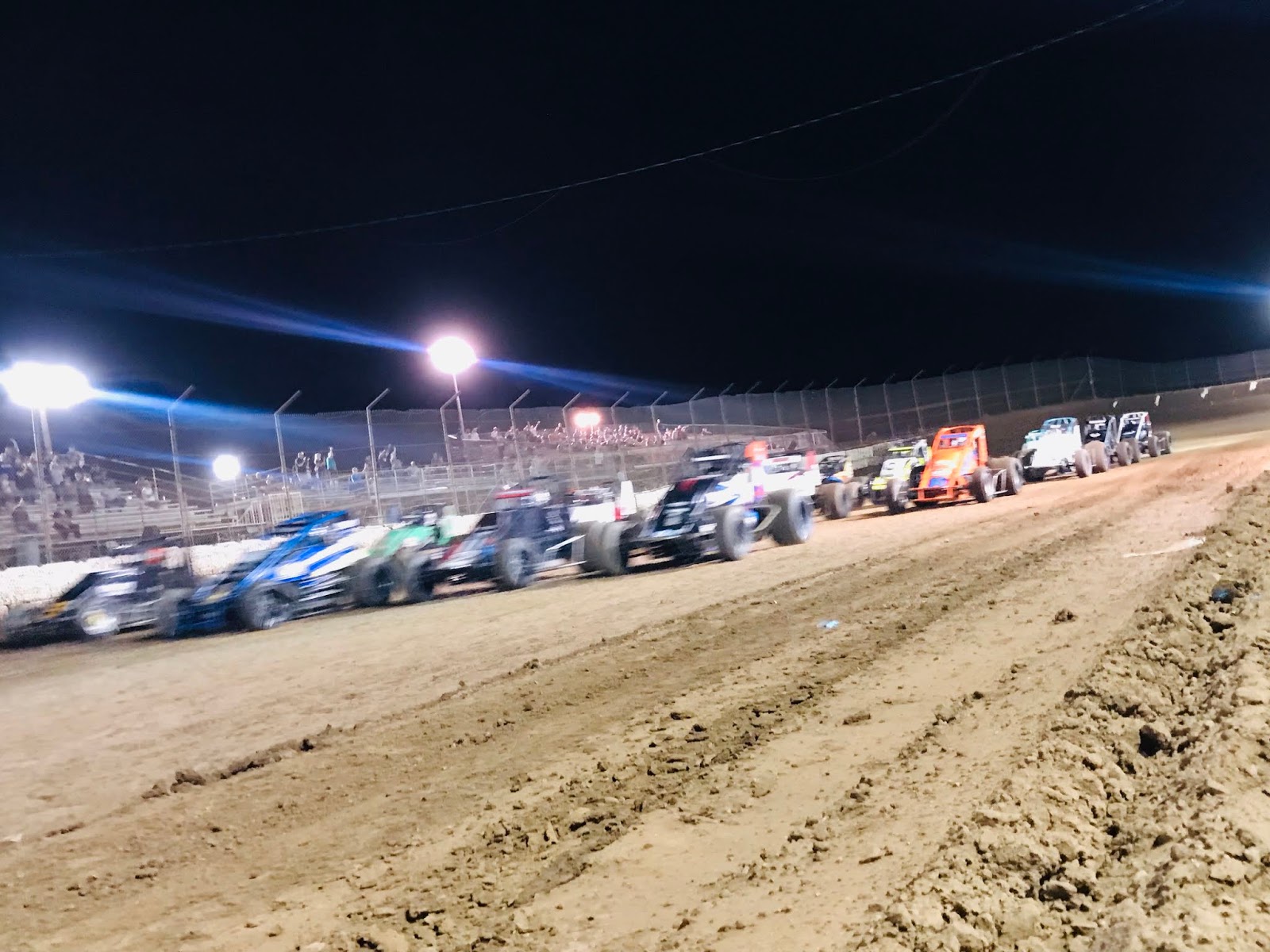 The Arizona Speedway Track Crew decided to do work on the surface, just as the feature was rolling onto the track. All cars and teams were asked to sit in the infield for approximately 20 minutes while Jonah watered the outside of the track and tilled the bottom of the surface, in both corners. After what seemed like an eternity, they were ordered to the track and given several hot pace laps to work the surface in. As is customary at every USAC event, the field a 4-wide salute to the fans!