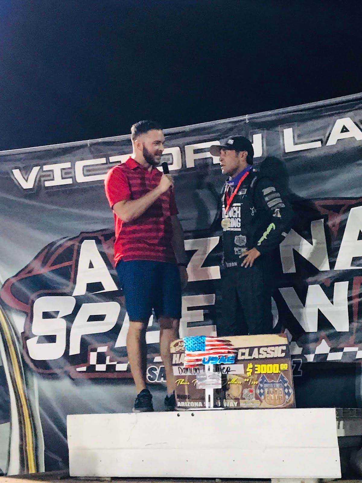 | Gardner chats with Arizona Speedway announcer, Jason Carter, after earning his $3,000 payday on Saturday night |