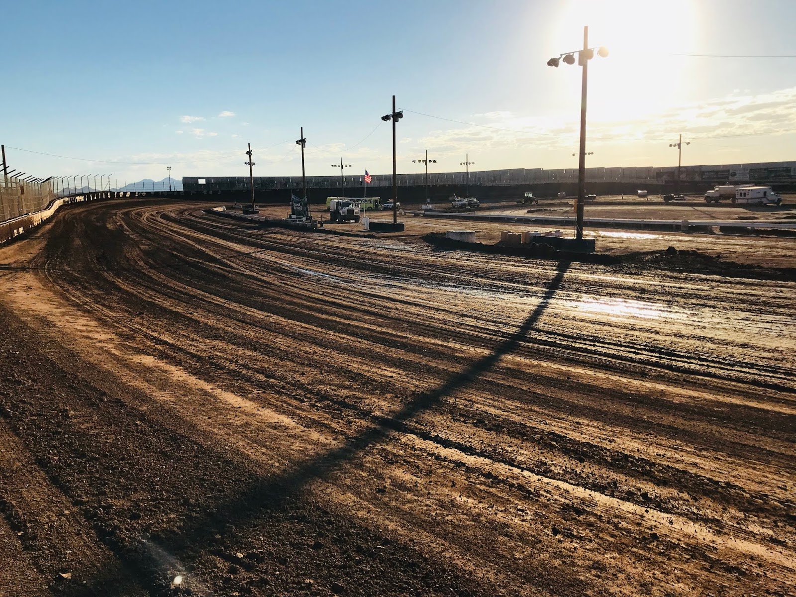 | Track conditions in turns 1 & 2 just before wheelpacking, as the sun begins to set behind Arizona Speedway |
