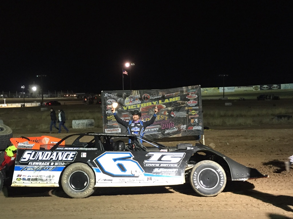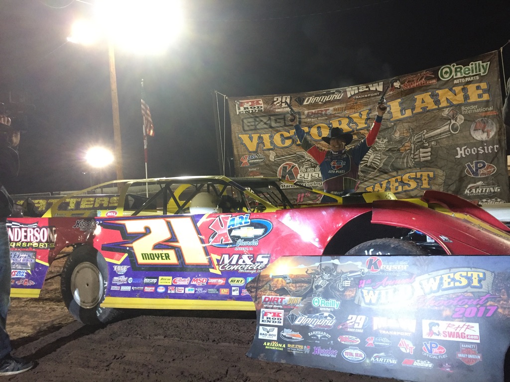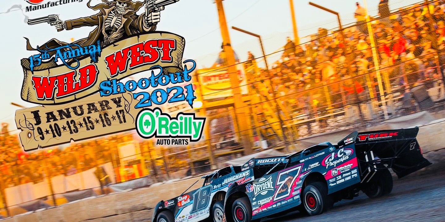 The Wild West Shootout is made possible by Keyser Manufacturing, O’Reilly Auto Parts, FK Rod Ends, Dirt Track Bank, Black Diamond Race Cars, Shaw Trucking, Schaeffer Oil, SportTruck RV, Mesilla Valley Transportation, Border Tire, Arizona Differential, RHR Racing Swag, Barnett Harley Davidson, Dirt Pro Grading & Padwork, Contractors & Developers (C&D) Bonding, Shocks by Hammer, Hoker Trucking, Premier Waste Services, Midwest Sheet Metal, Speedway Motors, Rodeo Chrysler Dodge Jeep Ram, VP Racing Fuel, Hoosier Racing Tires, Pro Power Engines, Penske Racing Shocks, Beaver Stripes, Gorsuch Performance Solutions, Toste Construction, Sipes Tractor & Transport Service, Total Ag Solutions, Merry’s Home Furnishings, The Joie of Seating, Schill Construction, Screven Motor Speedway, Whisler Investments, DirtDraft.com, FinishLine Graphics, and FloRacing.com